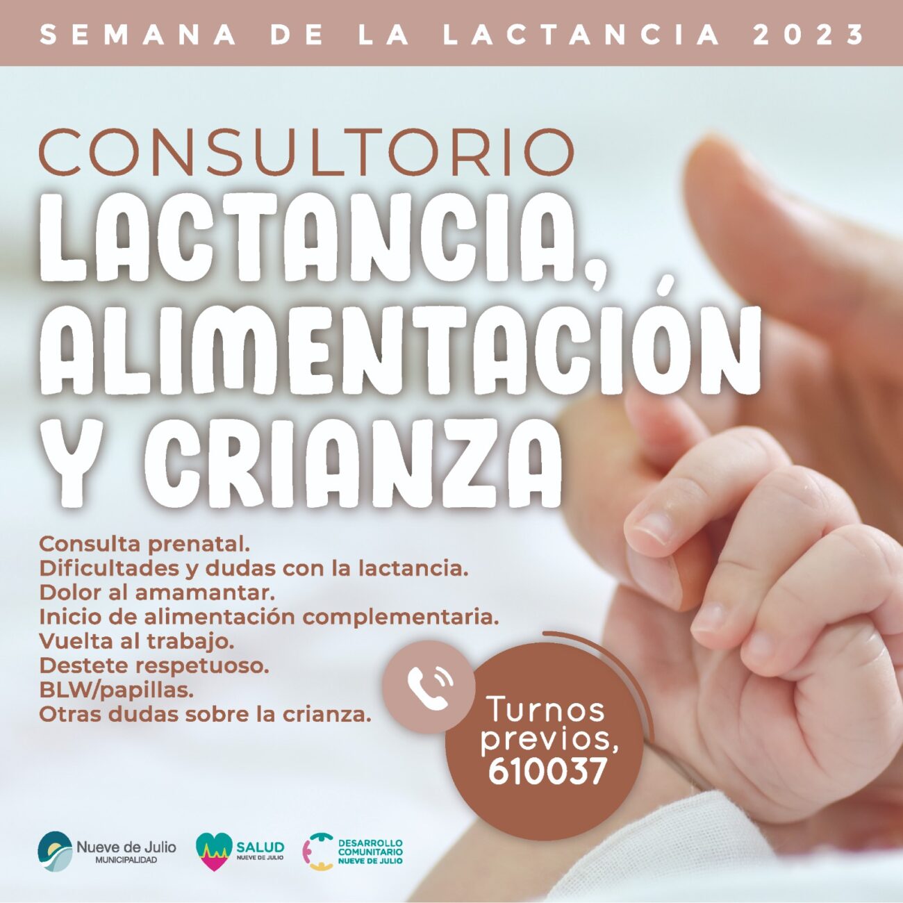 En el marco de la Semana de la Lactancia 2023 -que se extiende entre el 1ero. y 7 de agosto- la Municipalidad de Nueve de Julio, a través de las secretarías de Salud y Desarrollo Comunitario, desarrollará un consultorio sobre lactancia, alimentación y crianza, abarcando aspectos de consulta prenatal, dificultades y dudas sobre la lactancia, dolor al amamantar, inicio de alimentación complementaria, vuelta al trabajo, destete respetuoso, BLW/papillas y otras dudas sobre la crianza.