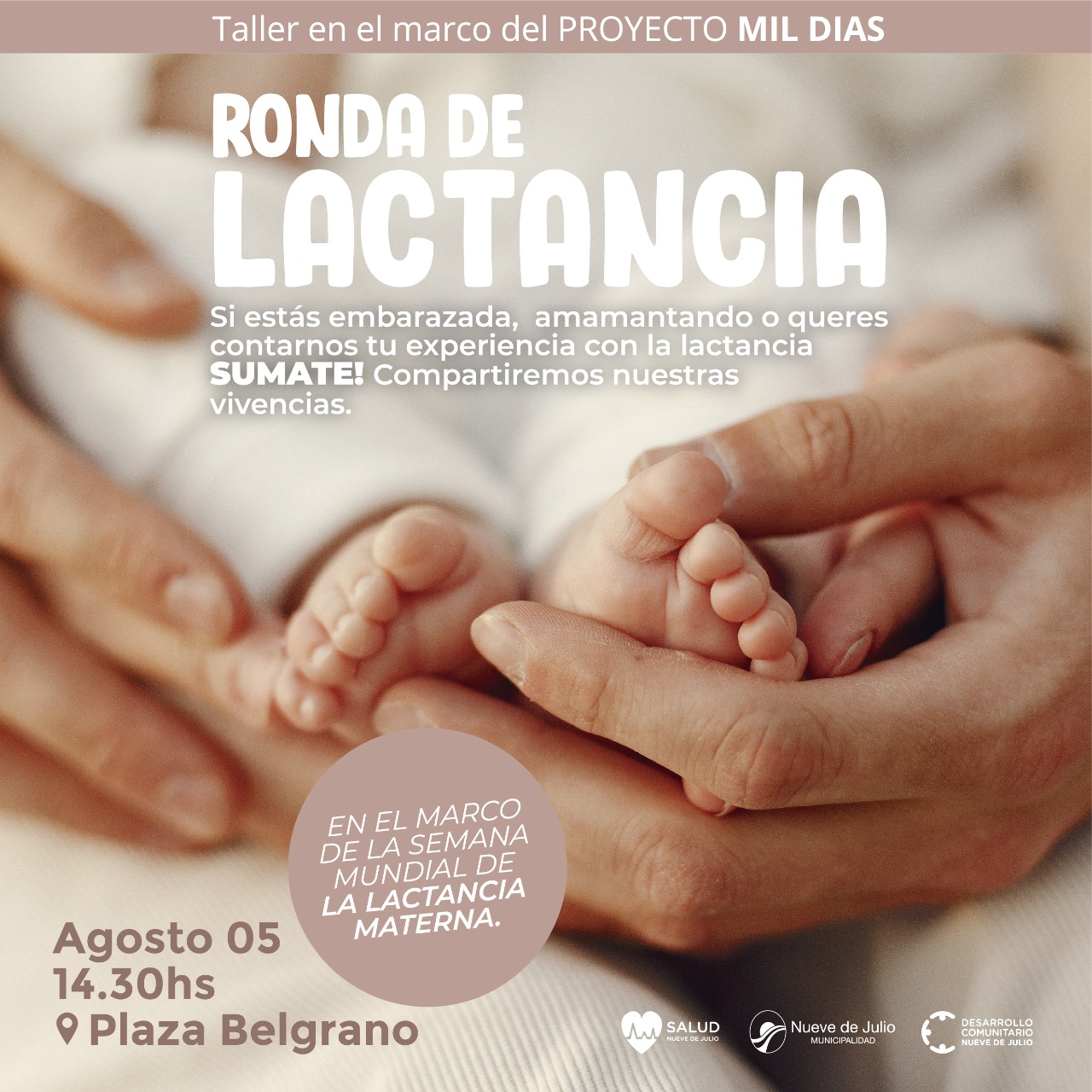 En el marco de la Semana Mundial de la Lactancia Materna, que se conmemora en el mes de agosto, el día viernes 5, desde las 14,30 hs. y en Plaza General Belgrano, se desarrollará una “Ronda de Lactancia”, propuesta que se enmarca en el proyecto “Mil Días”, que lleva adelante la Secretaría de Desarrollo Comunitario de la Municipalidad de Nueve de Julio.