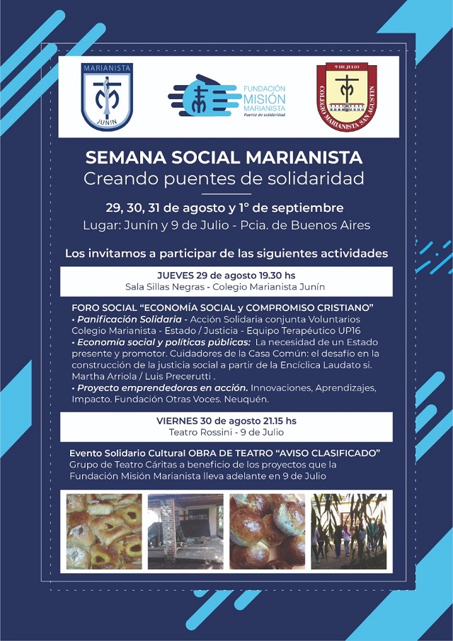 Los días 29, 30,  31  de agosto y 1 de septiembre se desarrollará en las ciudades de 9 de Julio y Junín la SEMANA SOCIAL MARIANISTA DEL OESTE. Esta actividad está organizada por la Fundación Misión Marianista.