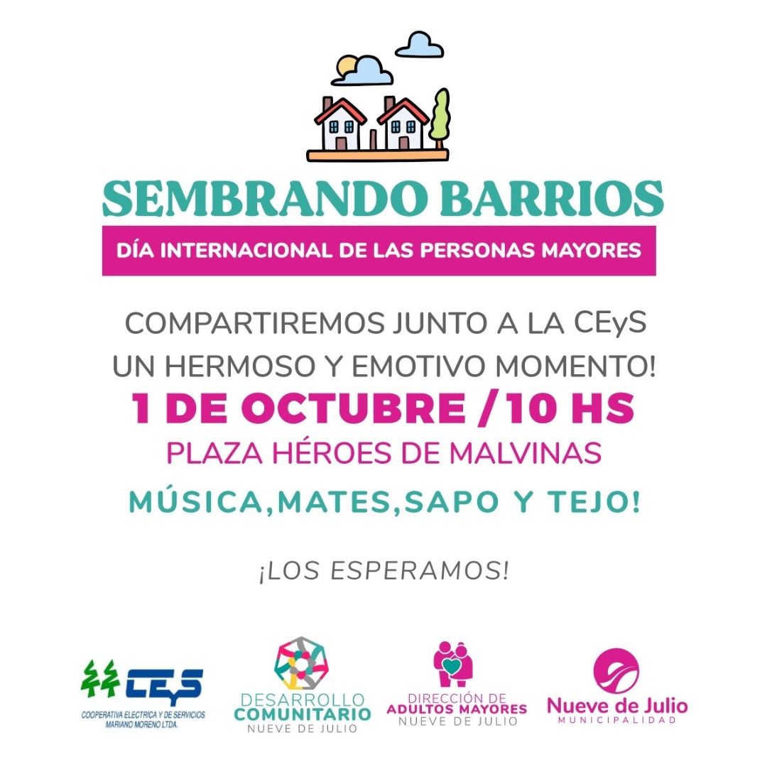 La Municipalidad de Nueve de Julio, a través de la dirección de Adultos Mayores, dependiente de la Secretaría de Desarrollo Comunitario; conjuntamente con la Cooperativa Eléctrica y de Servicios “Mariano Moreno”, conmemorará en el marco del programa “Sembrando Barrios”, el Día Internacional de las Personas Mayores; el martes 1ero. de octubre, desde las 10 hs., en la plaza del barrio Héroes de Malvinas.