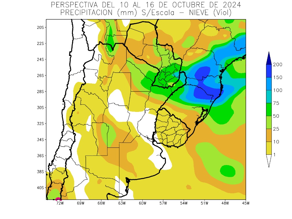 Debido al ingreso de una masa de aire polar en los días precedentes, la perspectiva agroclimática para la semana del 9 al 16 de octubre comenzó con temperaturas mínimas algo bajo lo normal en gran parte del área agrícola, con heladas generales en las zonas serranas del oeste, y heladas localizadas sobre las Serranías Pampeanas.