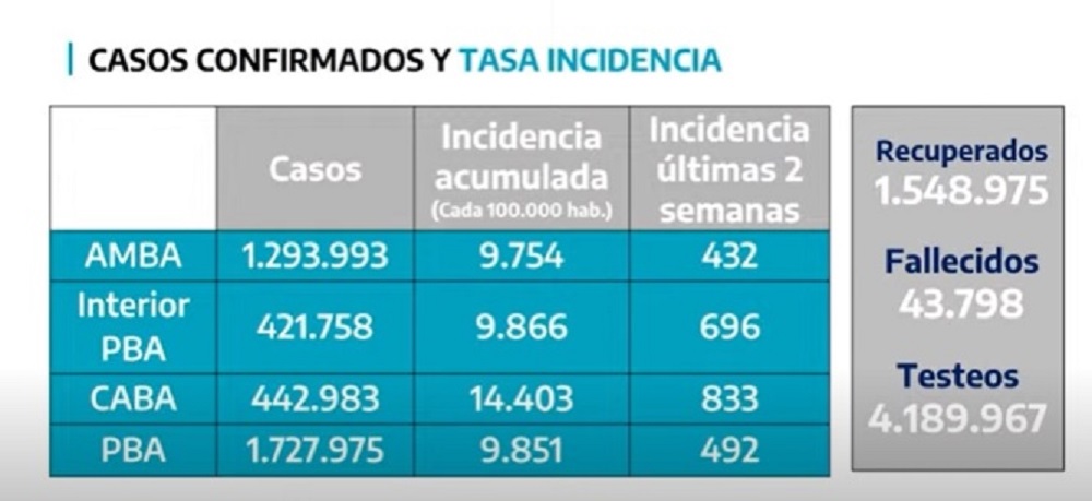 En el cierre de la semana epidemiológica 23, la incidencia de casos en el interior provincial es de 696 casos por cada 100 mil habitantes, mientras que en el AMBA es del 432 casos por cada 100 mil habitantes.