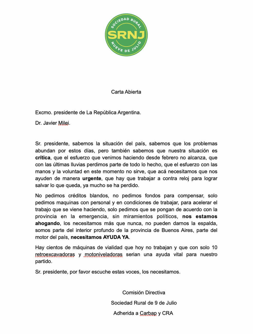 LocalesSociedad Rural 9 de Julio: Carta abierta al Sr. Presidente Javier Milei24 agosto 2025 FacebookTwitterPinterestWhatsAppImpresiónTelegram Últimas noticias Agroadmin - 6 diciembre 2025CARBAP: Duro repudio al endeudamientoBajo el título “Cargos para la política, deuda para los bonaerenses”, Confederacion de Asociaciones Rurales de Buenos Aires y... General Milei convocó a Extraordinarias admin - 6 diciembre 2025 Regionales FEMEBA: Las vacunas son seguras admin - 6 diciembre 2025 Locales Libertad para tirarse al agua admin - 6 diciembre 2025 Locales Festival de Compras con encendido del árbol y música admin - 6 diciembre 2025 Noticias relacionadas Libertad para tirarse al agua Locales admin - 6 diciembre 2025 Festival de Compras con encendido del árbol y música Locales admin - 6 diciembre 2025 Buscan endurecer penas contra motocicletas ruidosas Locales admin - 5 diciembre 2025 Tee de salida para el Open de 9 de Julio Deportes admin - 5 diciembre 2025