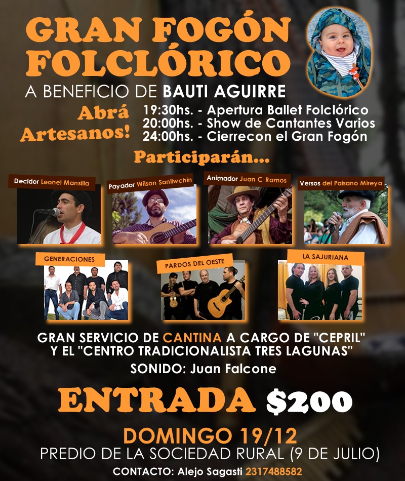 Este domingo 19 desde las 19:30hs habrá de desarrollarse en el campo de doma de Sociedad Rural de  9 de Julio un gran Fogón Criollo solidario en apoyo a Bauti Aguirre, el niño que padece Atrofia Muscular Espinal, y para quien se viene realizando  distintos espectáculos en la ciudad, en su apoyo.