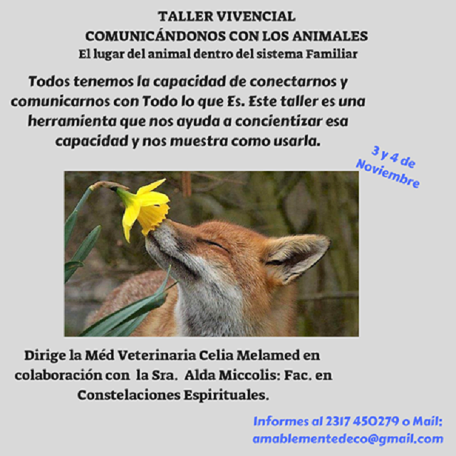 Todos nacemos con la capacidad de conectarnos con todo lo que Es. Con el tiempo esta capacidad se pierde y la dejamos de utilizar en forma consciente. Este taller es una herramienta que nos ayuda a recordar esta capacidad y a entender como el animal se vincula con el sistema familiar. Aprenderás a percibir como ellos perciben el mundo.