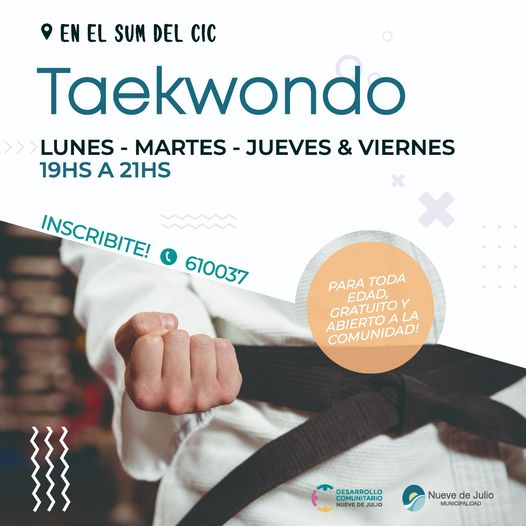 La Municipalidad de Nueve de Julio, a través de la Secretaría de Desarrollo Comunitario, invita a la comunidad en general a participar de los talleres de Taekwondo, que se dictan todos los días lunes, martes, jueves y viernes, de 19 a 21 hs, en el CIC, ubicado en French y Moreno.