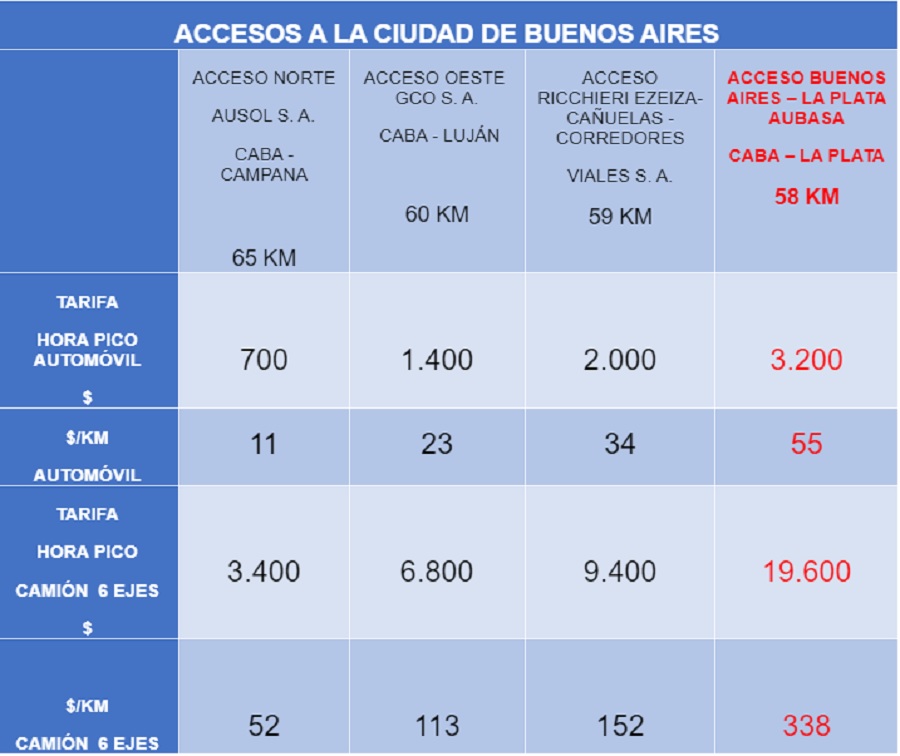 Aumento total acumulado en tan solo 5 meses, Autopista Buenos Aires – La Plata 440 %, Sistema Vial Integrado del Atlántico 385 %. Incremento gestión Axel Kicillof 3.500 a 3.700 %.