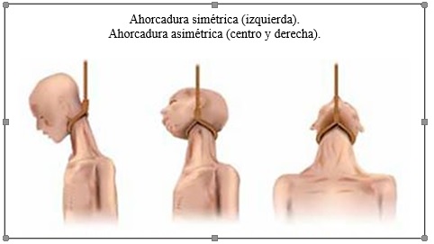 Figura 2: la figura muestra distintos tipos de ahorcadura, los cuales se clasifican en ahorcadura simétrica (izquierda) o ahorcadura asimétrica (centro y derecha). Fuente: www.criminologiaycriminalistica.com
