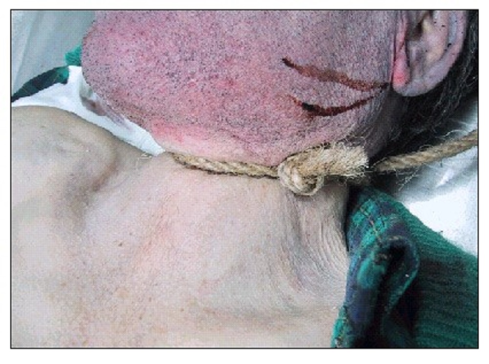 Estas distinciones serán fundamentales no solo para el análisis, sino para la correcta descripción del suceso observable. En este tipo de asfixias mecánicas pueden observarse una variedad de características, siendo de relevante importancia la principal lesión de carácter externo observable; es decir; el surco de ahorcadura. El surco de ahorcadura generalmente se produce de forma oblicua a causa de la gravedad del propio peso, ascendente hacia donde se halla el nudo. Por esta última razón, se encontrará más marcado en la zona contraria al nudo, soliendo estar interrumpido a la altura de éste por falta de contrapeso y presión. Muchas veces es posible visualizar la trama del lazo empleado (Figura 2).