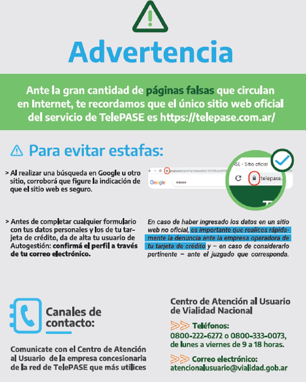 En línea con lo anterior, se recuerda que el sitio web oficial de TelePASE es https://telepase.com.ar/. Al realizar una búsqueda en Google u otro sitio, se recomienda corroborar que figure la indicación de que el sitio web es seguro.