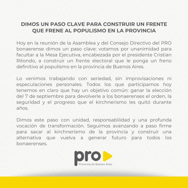 Por eso, el comunicado que sacó el PRO bonaerense es filoso. Anuncia su vocación de armar un frente opositor en la provincia, pero sin la confirmación de una alianza con La Libertad Avanza.