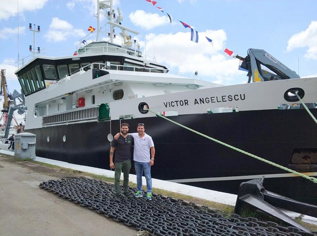 El “Víctor Angelescu” luce flamante amarrado en el puerto de Buenos Aires. Y  lo es, ya que fue botado en España hace solo seis meses, pero ya tiene varias millas náuticas recorridas, incluidos un cruce del Atlántico y un rastrillaje en el Mar Argentino. Es un buque oceanográfico que ahora pertenece al Instituto Nacional de Investigación Pesquera (INIP) que tiene su sede en la ciudad de Mar del Plata. Y entre su tripulación hay un nuevejuliense : Enzo Mastroliberto, ingeniero informático que  tiene a su cargo el mantenimiento de la red y los servidores del sistema de la embarcación. Es el System Manager del buque. Trabajaba en el Ministerio de Agroindustria y, por esos simples movimientos del destino, decidió pasarse al Instituto de Investigación Pesquera, mudanza a Mar del Plata obligada. Un cambio de vida buscado que ya lleva tres años. Así, Enzo fue elegido para ser parte del personal para traer al “Víctor Angelescu” en su viaje inaugural desde la Madre Patria hasta nuestras costas.