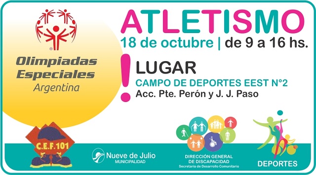 El venidero miércoles 18, en el Campo de Deportes de la Escuela de Educación Secundaria Técnica (EEST) Nro 2, “Mercedes Vázquez de Labbé”, ubicado en Acceso Presidente Perón y J.J. Paso, se realizará una nueva edición del Torneo de Atletismo Regional, destinado a personas con discapacidad intelectual, en el que participarán las ciudades de Chivilcoy, Bragado, Gral. Viamonte, Carlos Casares, Junín, Chacabuco, Bolívar y Nueve de Julio, representado por la Escuela de Educación Especial Nro. 501 y la Escuela de Atletismo Municipal.