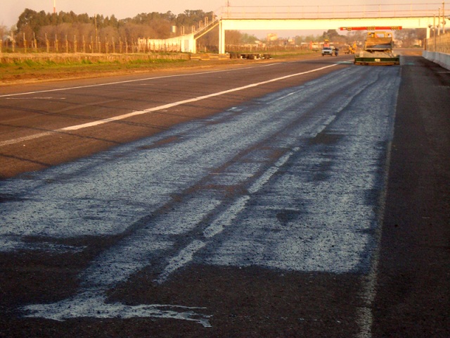Sobre la recta principal se está colocando una emulsión y arenado, el cual mejora la condición de la pista, evitando el desprendimiento de “piedrita” y favoreciendo el engomado de la pista.
