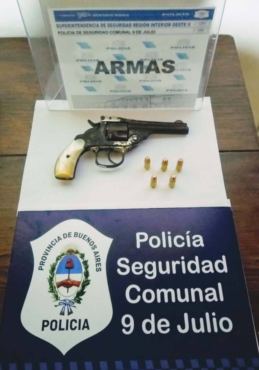 En el Día de la Fecha, en horas de la madrugada, personal de la estación de policía de 9 de Julio procede a dar cumplimiento a orden de allanamiento dispuesta por el Juzgado de Garantías numero 3 de Mercedes en domicilio emplazado en calle Dr West al 200 donde se procedió a la detención de un masculino de 43 años de edad incautando del interior del domicilio un revolver calibre 32 sin marca ni numeración visible y 5 municiones intactas en su tambor. Que en calles Compairé al 700 también en el marco de la misma causa se procedió a la detención de un masculino de 31 años cómplice del sujeto de 43 años de edad. Este hecho ocurrió en el mes de Junio del corriente año en donde detenidos con arma de fuego amenazaron a una femenina de 37 años y a su grupo familiar golpeando a su esposo produciendole lesiones.