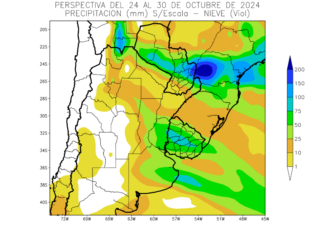 • El norte y el centro del NOA, el norte de la Región del Chaco, gran parte de la  Mesopotamia, el este de la Región Pampeana, la mayor parte del Paraguay y gran parte del Uruguay observarán precipitaciones moderadas a abundantes (10 a 50 mm), con focos con valores superiores a 75 mm y otros focos aislados con valores inferiores.