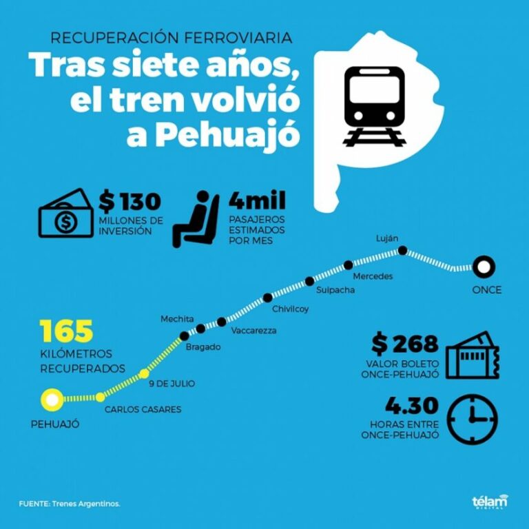 Según informó Trenes Argentinos, esta semana iniciará un servicio que partirá los viernes desde la Capital a las 20.55 horas y arribará el sábado a las 6.41 horas a la ciudad de Pehuajó.
