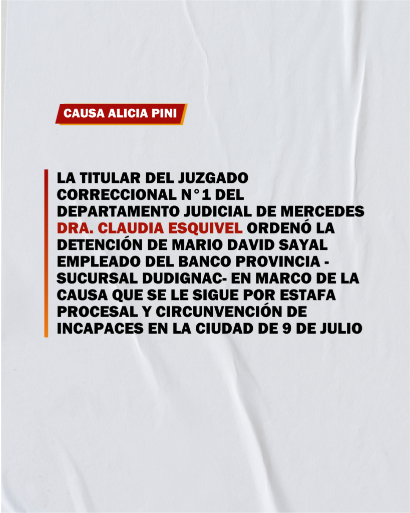 LocalesULTIMO MOMENTO: Causa Alicia Pini13 febrero 2025 FacebookTwitterPinterestWhatsAppImpresiónTelegram 🔴 AMPLIAREMOS 🔴Últimas noticias DeportesMartin Parise - 18 diciembre 2025Navone avanzó a semifinales en el Road To AustraliaEl Road to Australia, que se está disputando hasta el 20 de diciembre Buenos Aires Lawn Tennis Club, ya... Locales Naudín: «El cuerpo decide quienes son sus representantes» admin - 18 diciembre 2025 Regionales Bronca en Roque Pérez: un alerta para 9 de Julio admin - 18 diciembre 2025 Música Keith Richards frenó a la gira 2026 de los Rolling Stones admin - 18 diciembre 2025 Locales Becas Municipales 2026: cierra la inscripción admin - 18 diciembre 2025 Noticias relacionadas Naudín: «El cuerpo decide quienes son sus representantes» Locales admin - 18 diciembre 2025 Becas Municipales 2026: cierra la inscripción Locales admin - 18 diciembre 2025 Doble despiste Locales admin - 17 diciembre 2025 “Chapu” Astoviza, cierre de año que va como piña Locales admin - 17 diciembre 2025