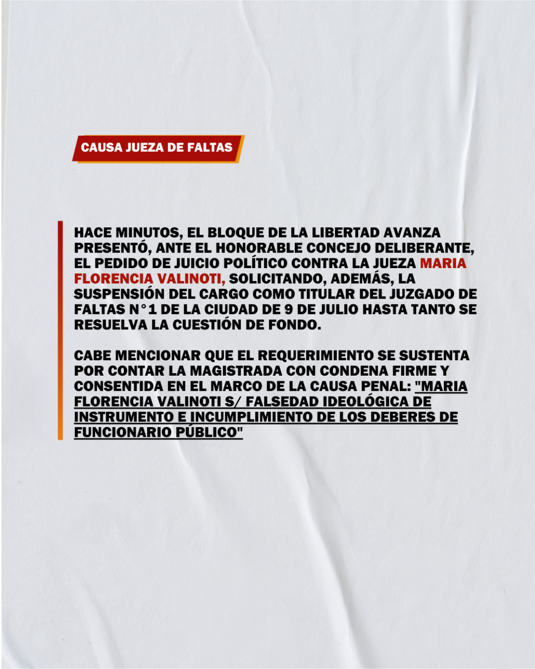 LocalesÚLTIMO MOMENTO: Causa Jueza de Faltas Maria Florencia Valinoti17 marzo 2025 FacebookTwitterPinterestWhatsAppImpresiónTelegram AMPLIAREMOS!Últimas noticias Agroadmin - 12 diciembre 2025Sociedad Rural: Tiempos difíciles, grandes decisiones Regionales La Justicia ordenó aplicar de inmediato la Ley de Emergencia en Discapacidad admin - 12 diciembre 2025 Deportes Con el clásico de barrio se abre la novena del fútbol nuevejuliense Martin Parise - 12 diciembre 2025 Locales Amenazas y heridas graves de un vecino a otro admin - 12 diciembre 2025 Regionales Emergencia agropecuaria para la provincia de Buenos Aires admin - 12 diciembre 2025 Noticias relacionadas Amenazas y heridas graves de un vecino a otro Locales admin - 12 diciembre 2025 Nueva edición de la Fiesta Provincial del Lechón en Morea Locales admin - 12 diciembre 2025 Colocación de piedra en barrios de la ciudad Locales admin - 12 diciembre 2025 Concejo Deliberante: recambio, asunciones, rosca política y una nueva correlación de fuerzas Locales admin - 11 diciembre 2025
