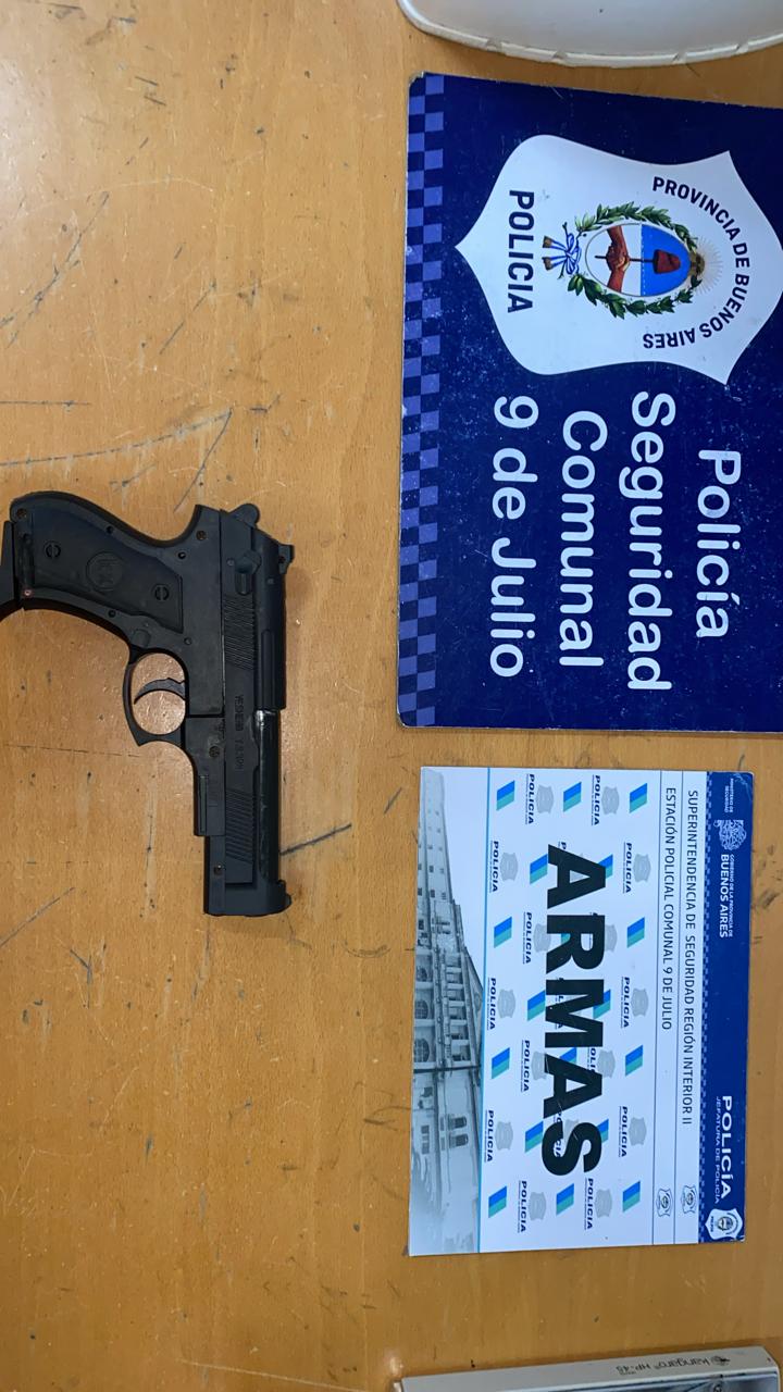 El viernes 19 se toma conocimiento que en un establecimiento educativo de la ciudad ubicado en calle Vedia y Gral. Paz, se hace presente un joven menor de edad, el cual intenta ingresar al establecimiento, exhibiendo un arma y amenazando. En virtud de ello, el Personal del Gabinete Técnico Operativo comienza a dar búsqueda de dicho masculino, procediéndose a la identificación del mismo el cual resultaba ser menor de edad, y a establecer que utilizaba como elemento de amedrentamiento un arma replica de plástico tipo 9 MM, la cual además había utilizado días antes en una situación similar fuera de la plaza Italia.