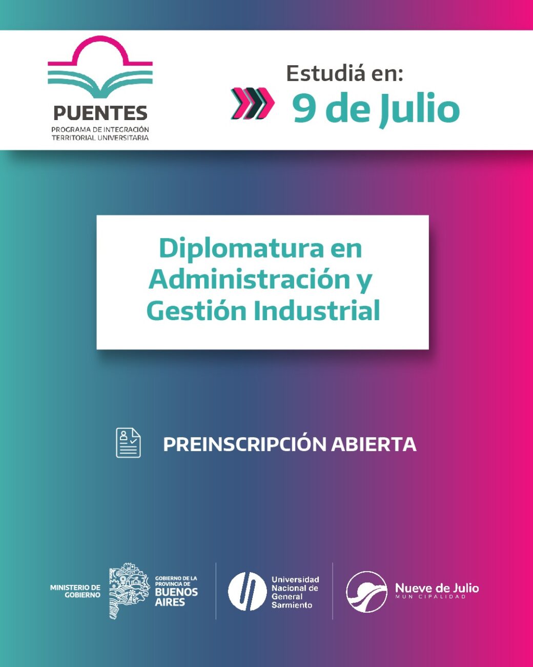 La Municipalidad de Nueve de Julio anunció la apertura de inscripciones para una nueva Diplomatura en Administración y Gestión Industrial. La iniciativa se integra a la oferta educativa local a través del Programa Puentes, cuenta con el respaldo académico de la Universidad Nacional de General Sarmiento.