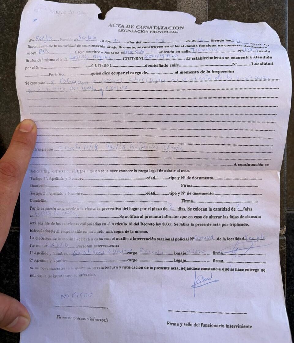 “Se tuvo que bajar del móvil a firmar el acta. Pero nunca entró al local. No entró a verificar nada de lo que decia el acta, que ya estaba labrada de antemano. No tenía un sello de ninguna dependencia, solo una firma, un garabato, pero ni un sello del Municipio ni de Policia” relató Fernández y agregó que “al día de hoy, en Fiscalia no está el acta. Tampoco la tiene nuestro abogado”.