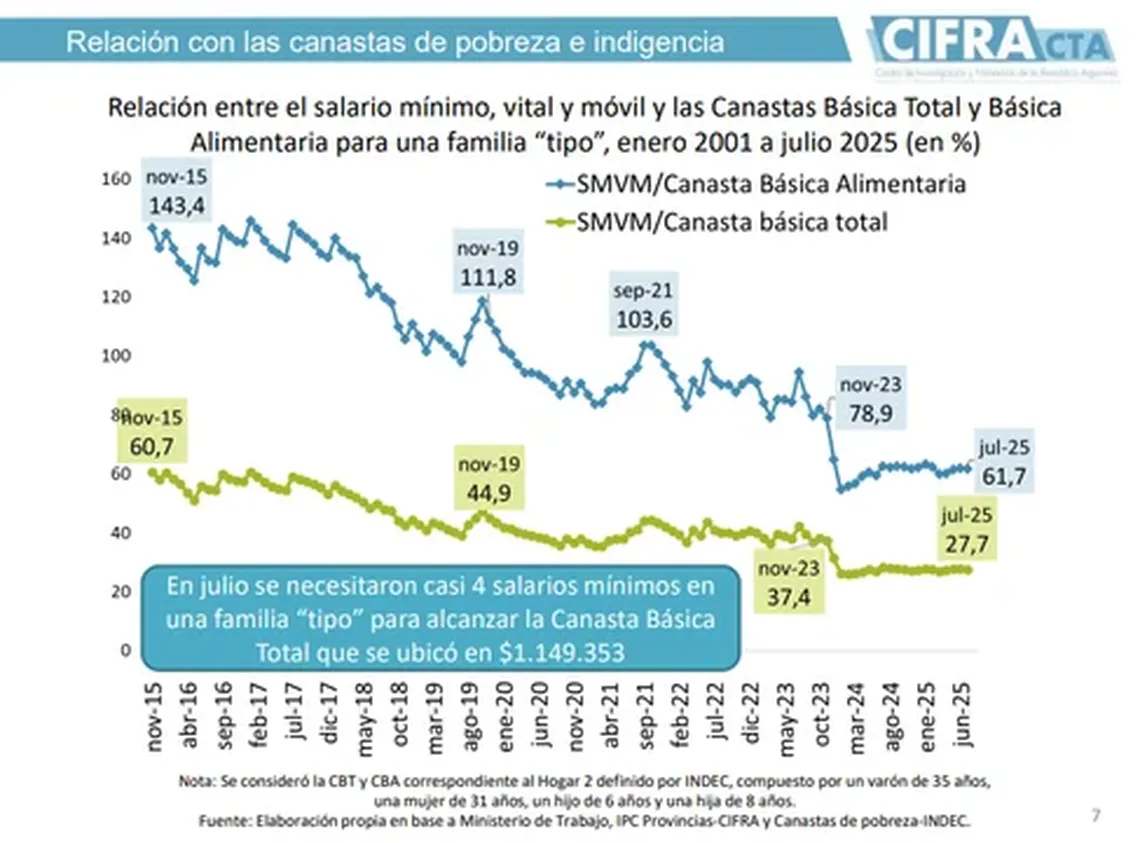Una familia tipo en la Argentina necesitó en julio casi cuatro salarios mínimos para cubrir el costo de la canasta básica y no caer bajo la línea de pobreza, según reveló un informe del Centro de Investigación y Formación de la República Argentina (CIFRA-CTA).