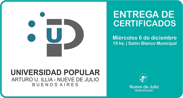 La Universidad Popular «Arturo Illia», llevará adelante el próximo miércoles 6 de diciembre, a las 19:00 hs. y en el Salón Blanco del Palacio Municipal, el acto de entrega de certificados a los egresados de los distintos cursos dictados a lo largo del año, instancia que se complementará con una muestra y exposición de trabajos en el salón de las Américas, abierta a toda la comunidad.