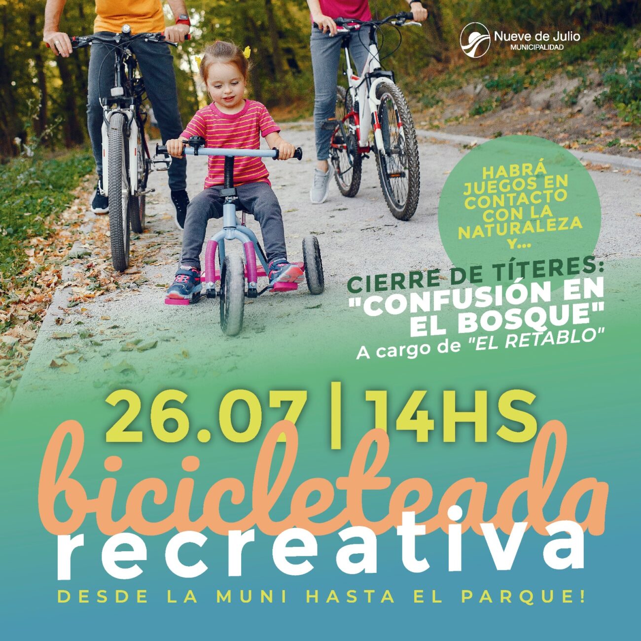 Con la idea de fomentar la actividad deportiva, de salud y lo recreativo, se saldrá en bicicleta a las 14 hs  desde el Palacio Municipal, hacia el Parque Gral. San Martín, lugar en el que se realizarán juegos en contacto con la naturaleza y habrá un espectacular cierre con una función de títeres a cargo de Compañía “El Retablo” con la obra:  » Confusión en el bosque «.