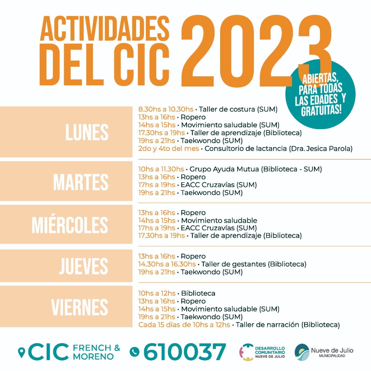 La Municipalidad de Nueve de Julio, a través de la secretaría de Desarrollo Comunitario, invita a participar de las variadas actividades abiertas a la comunidad que se llevan a cabo en el Centro Integrador Comunitario (CIC), de calles French y Moreno.
