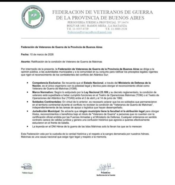 En una firme declaración emitida desde la provincia de Buenos Aires, diversas organizaciones de excombatientes han ratificado su postura respecto a quiénes deben ser considerados legítimamente como Veteranos de Guerra de Malvinas (VGM). La Federación de Veteranos de Guerra de la Provincia de Buenos Aires, junto con la agrupación de la localidad de 9 de Julio, han manifestado su rechazo ante lo que califican como intentos de «usurpación» del título honorífico por parte de personas que no participaron directamente en el conflicto bélico de 1982.