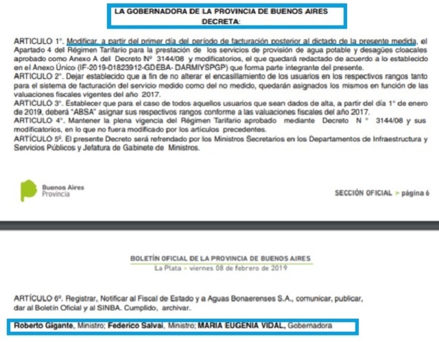 La gobernadora María Eugenia Vidal autorizó, mediante el decreto N°58/19 publicado este viernes en el Boletín Oficial, a Aguas Bonaerenses S.A. (ABSA) a elevar un 38% el valor de la tarifa por el servicio de agua potable y cloaca.