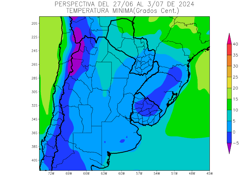 • El este del NOA, el este de la Región del Chaco, la mayor parte de la Mesopotamia, el sudeste del Paraguay, gran parte de Cuyo, la Región Pampeana y la mayor parte del Uruguay observarán temperaturas mínimas superiores a 0°C, con riesgo de heladas generales y con un foco sobre el norte con valores superiores a 5 y 10°C y otros focos con valores menores.