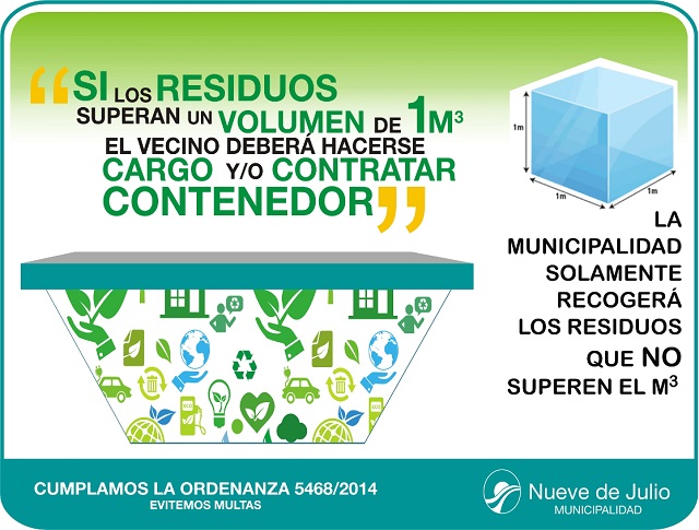 La Municipalidad de Nueve de Julio recuerda que está en plena vigencia la Ordenanza Nro. 5468/2014, que establece la obligatoriedad del retiro de productos de demolición, escombros, tierra, ramas, carpidos y todo otro residuo cuya superficie supere el m3 en contenedores o volquetes; siendo pasible la aplicación de contravenciones y/o multas todos aquellos propietarios de inmuebles o constructores que incumplan con esta normativa.